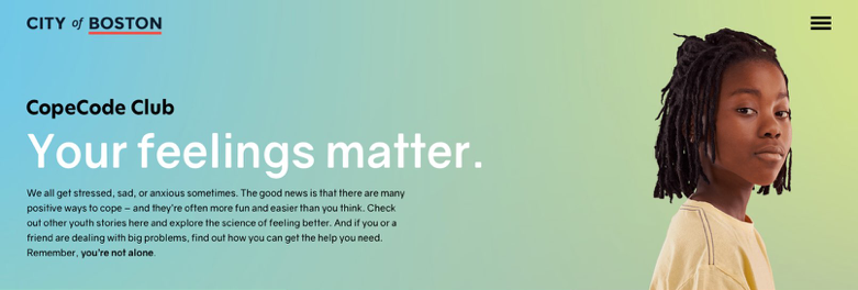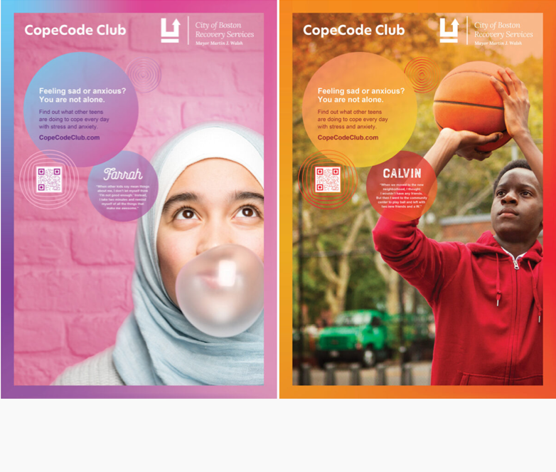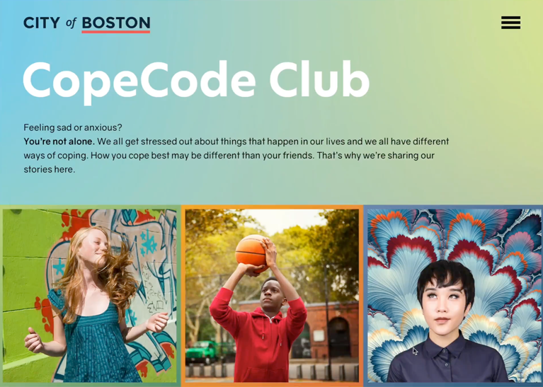 Creation and launch of CopeCode Club: You’re not alone, a campaign that supports Boston youth in identifying healthy ways to cope with difficult feelings, like stress, anger and self-esteem, or situations like the COVID-19 response produce.