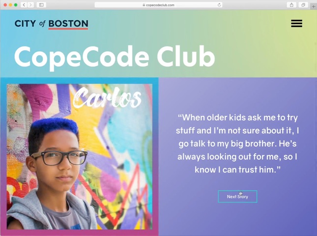 Creation and launch of CopeCode Club: You’re not alone, a campaign that supports Boston youth in identifying healthy ways to cope with difficult feelings, like stress, anger and self-esteem, or situations like the COVID-19 response produce.